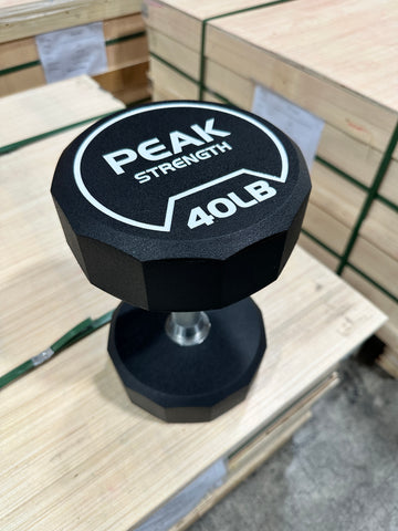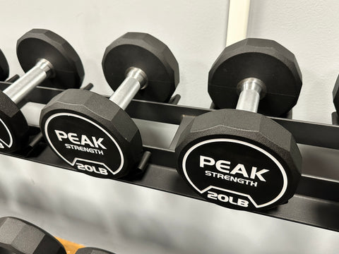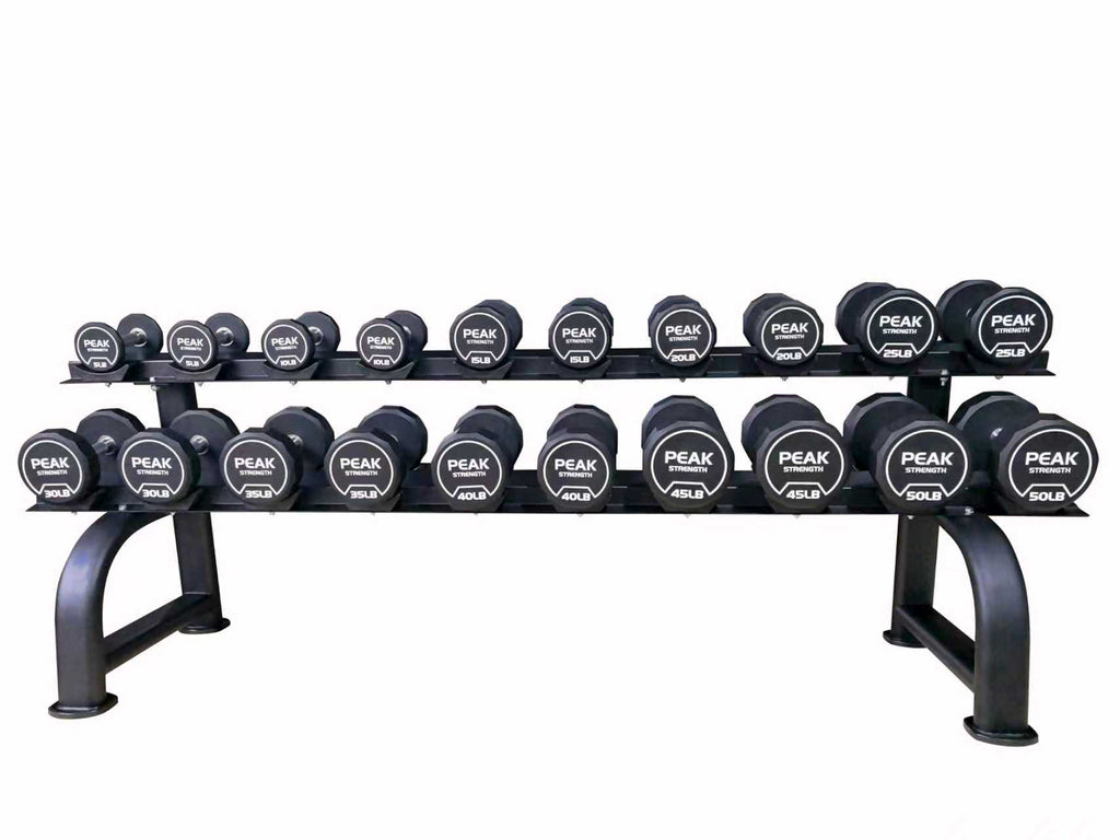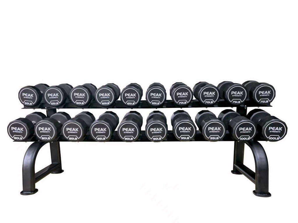 - Hex weight heads with white weight markings with a Peak Strength logo in white creates a sleek look
