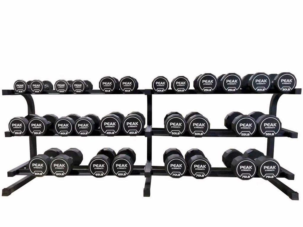 - Hex weight heads with white weight markings with a Peak Strength logo in white creates a sleek look