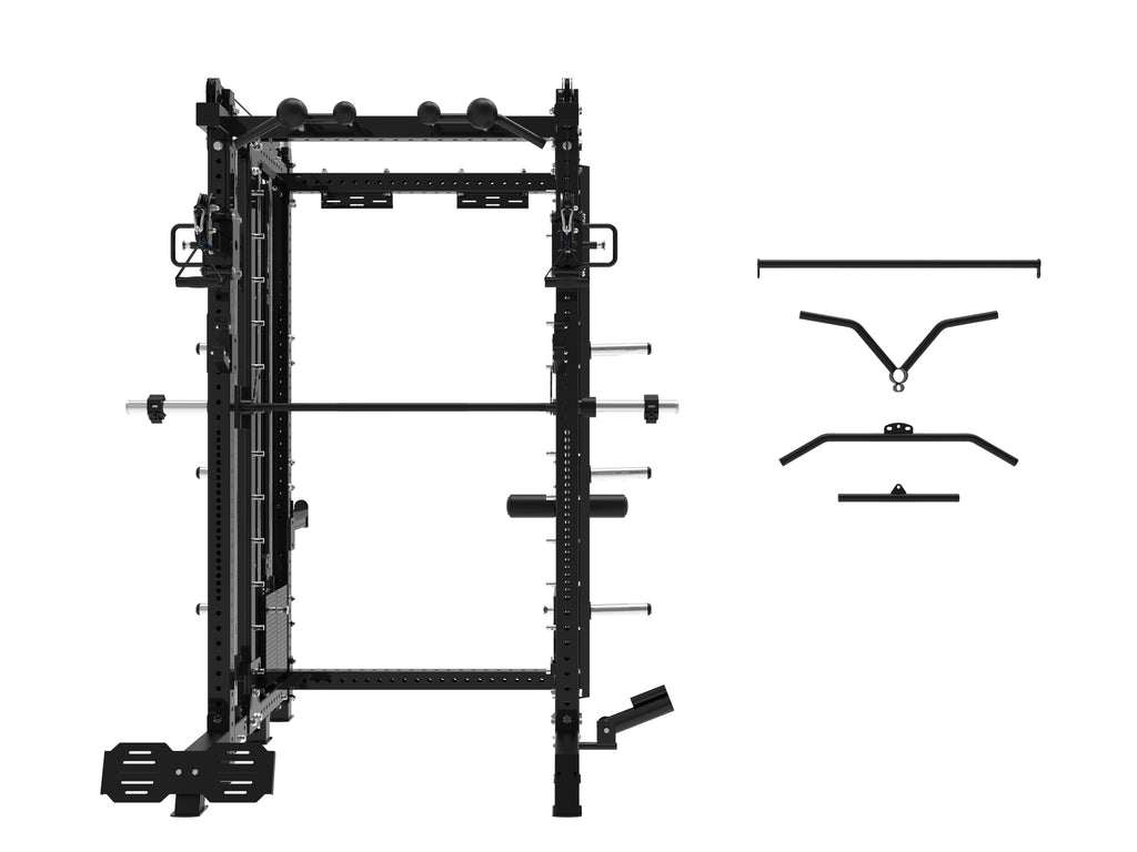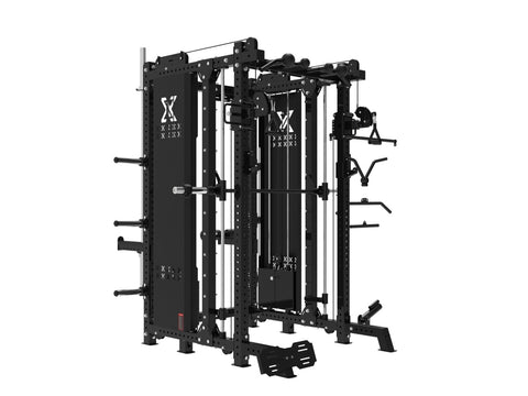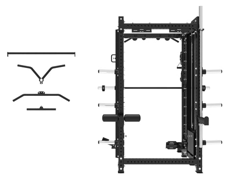 The Multi-Function Trainer is our new and improved multi functional power rack and smith machine designed to bring all aspects of the gym. The main frame is constructed out of 3x3 heavy-duty gauge steel. This unit is equipped with J hooks and spotter arms with space to safely perform barbell exercises like squats and bench press and it also features a Smith machine rated to 350kg, perfect for allowing you to train in a fixed plane of motion. This is also great for hypertrophy training and can help to give you the stability to isolate muscles more effectively. The rack also boasts 2 adjustable cable pulleys allowing you to pull, push, and fly from any position, high or low, and the two 220LB weight stacks (on a 2:1 ratio) give you ample weight to unlock an unlimited amount of exercises for you to add to your workouts. In addition, the rack features a pull-up bar, adjustable dip station, low row footplate, a landmine attachment and cable handles. This machine is perfect for home gyms, personal training studios, or any space where an all-in-one solution is needed in a small footprint.